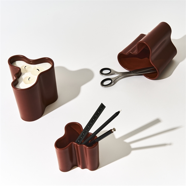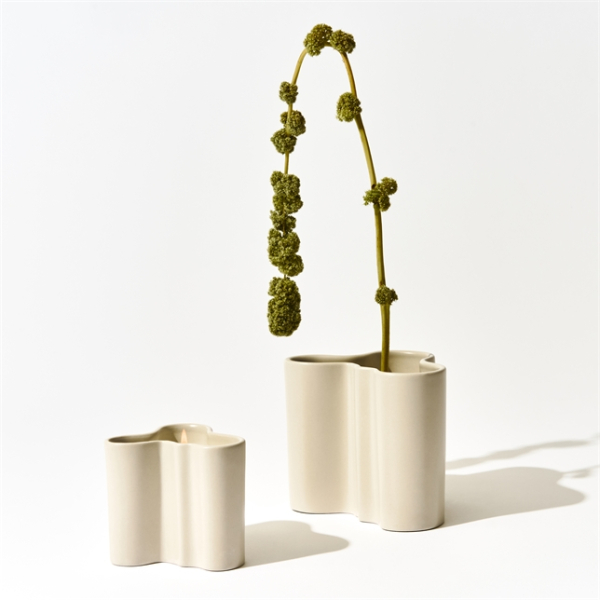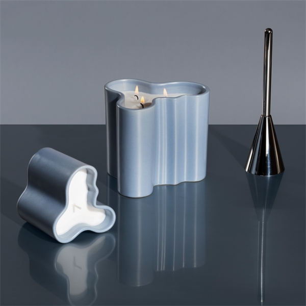 Keramična posoda, v kateri je sveča, ima ikonično valovito obliko vaz Alvarja Aalta.