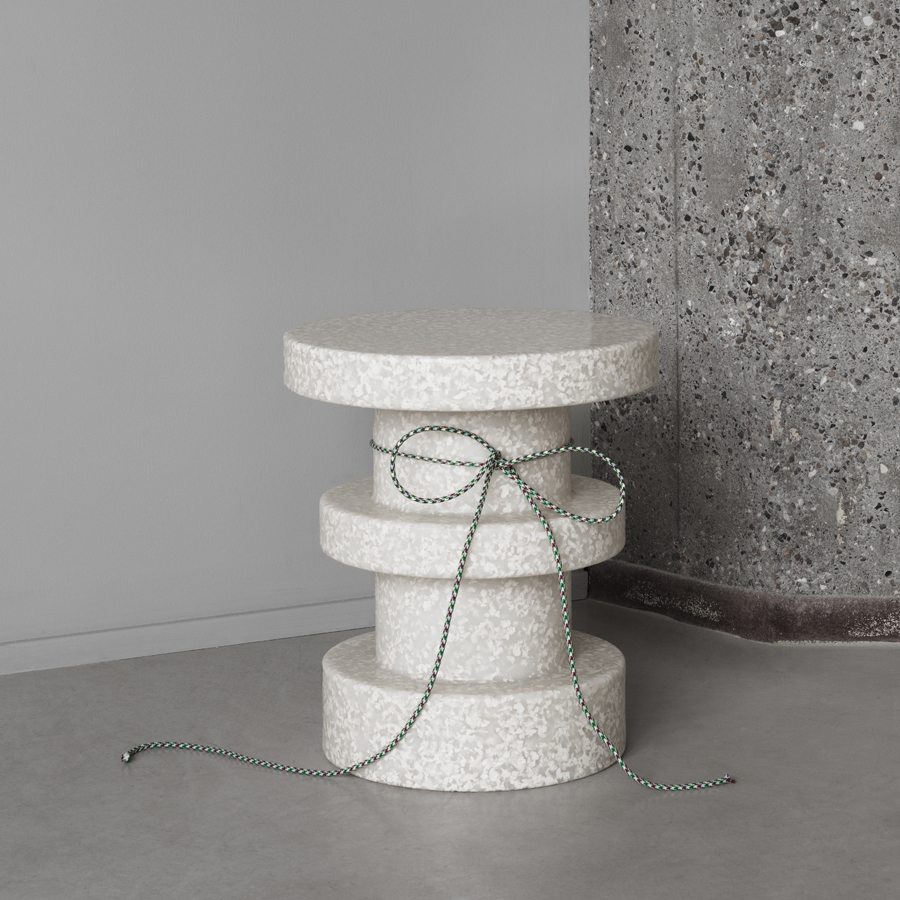 Preprost, uporaben videz je v nasprotju s slikovito površino, sestavljeno iz majhnih koščkov 100-odstotno reciklirane gospodinjske in industrijske plastike. Poseben postopek, kjer se delci plastike segrejejo do tališča pri 120 °C, omogoča večkratno ponovno uporabo in ponovno segrevanje materiala, ne da bi se spremenile njegove lastnosti.