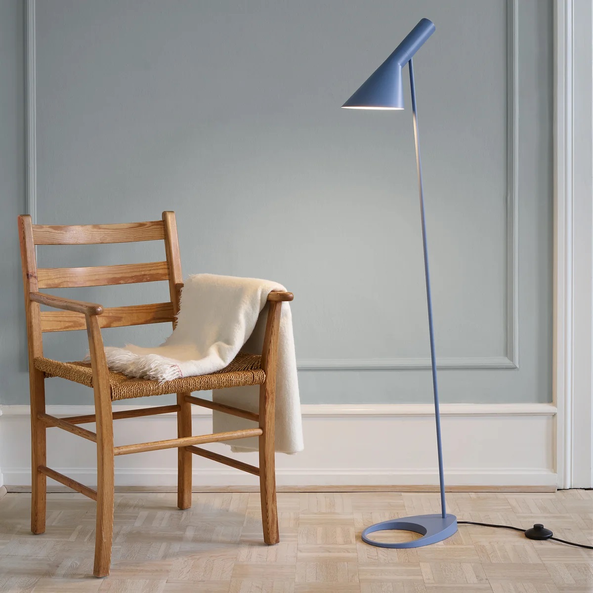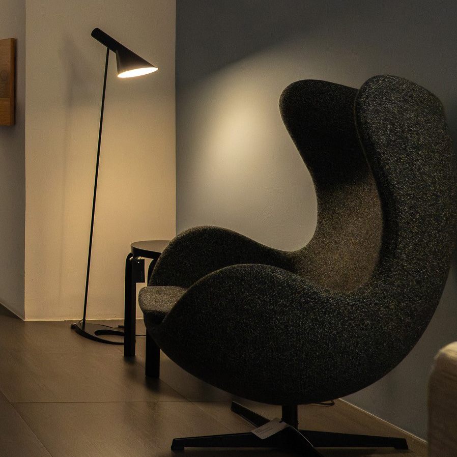 Nastavljiv stožčast senčnik ima belo  pobarvano notranjost, kar ustvarja mehko in prijetno svetlobo brez bleščanja. Linija AJ je postala danska ikona oblikovanja in eden najbolj priljubljenih kosov, ki jih je ustvaril Arne Jacobsen.