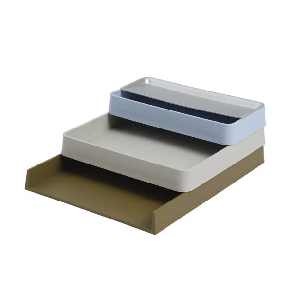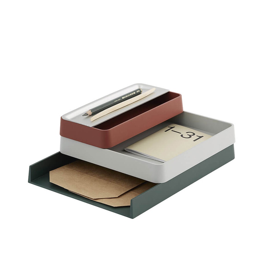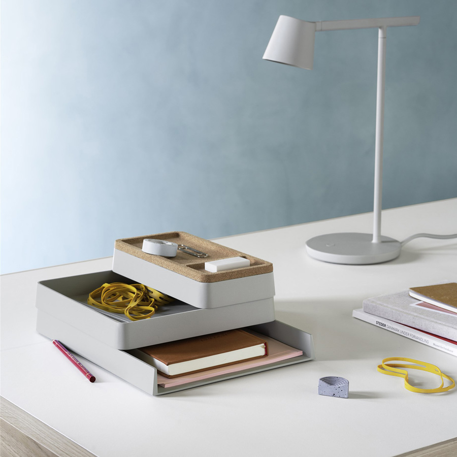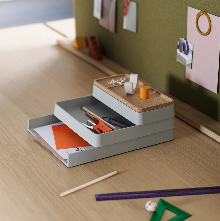 Serija Arrange Desktop ima prilagodljivo zasnovo, ki s svojim igrivim značajem in arhitekturnim izrazom prinaša elegantno funkcionalnost v domačo pisarno ali na delovno mesto. S pladnji, izdelanimi iz 100 % reciklirane plastike in pokrovi iz plute ali eloksiranega aluminija serija Arrange Desktop prinaša trajnostni pogled na sodobno shranjevanje.